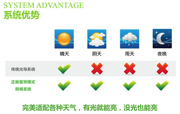 正能量科技雙模式無電照明系統又稱光導管照明系統、自然光照明系統等,工作模式分為白天模式和夜間模式;完美適配各種天氣,有光能亮、沒光也能亮,可輕松實現24小時0電照明;且整套系統一次性投資,2年可回本、25年以上免費使用!
